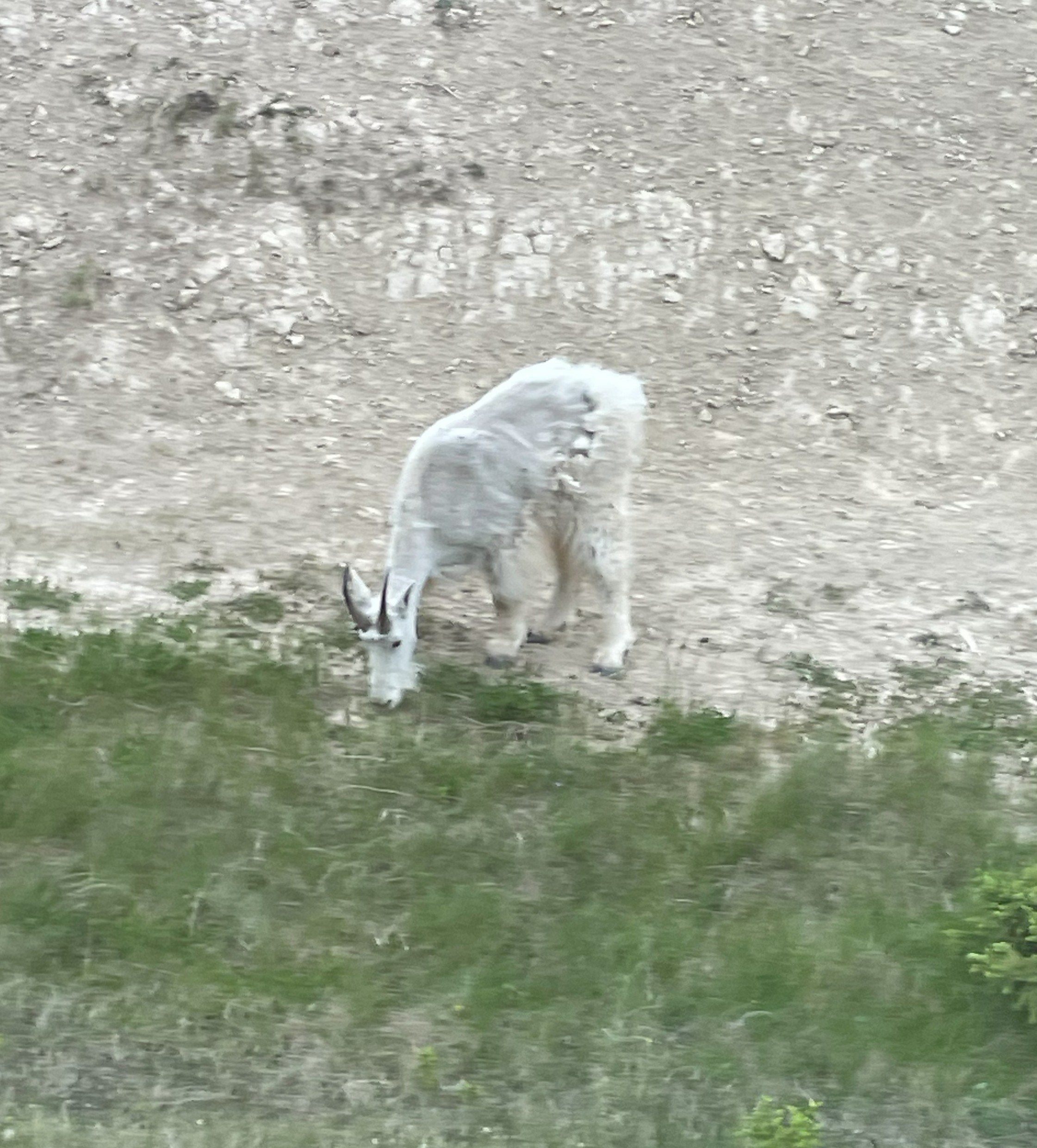 Mountain goat grazing by the side of the road near Maligne Lake.