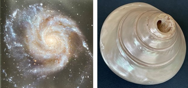 Picture above depicts spiral forms found in developing systems throughout the universe. Left, the Pinwheel Galaxy 25 million light years from earth. Photo, the Hubble Consortium, NASA, ESA. Right, a conch shell on my table here on earth. Photo, Ranjan Mukherjee